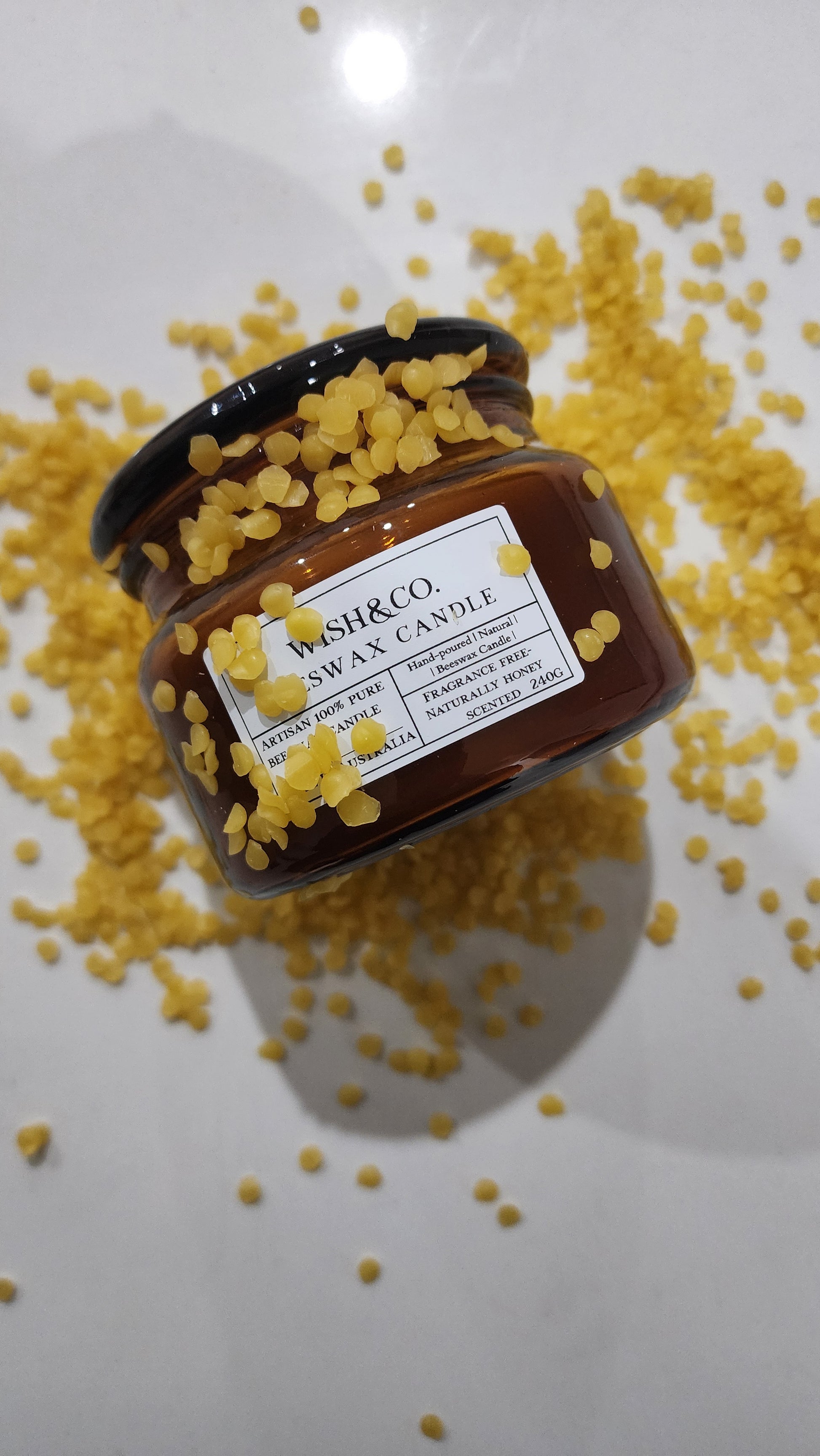 Our hand-poured beeswax candles come in vintage amber apothecary jars with beautiful lids — a charming, timeless piece for your home.